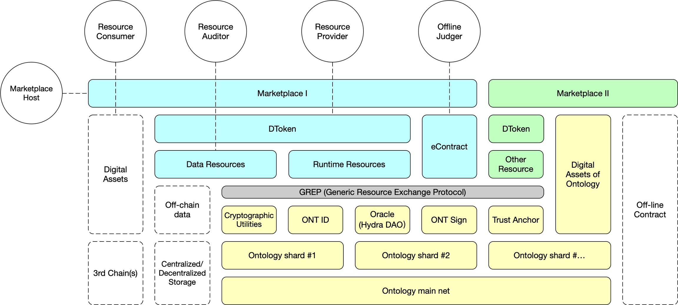 In the GREP, the Ontology public chain provides an important decentralized foundation of trust. Each user, including the resource provider, resource consumer, resource verifier and off-chain judge, needs to generate a corresponding ONT ID for themselves, and register and/or complete related KYC authentication according to the needs of the marketplace. Resources need to be registered on the chain during the transaction. When registering, the unique code of the resource is usually extracted to create a digital fingerprint, and the corresponding ONT ID is generated for the resource.